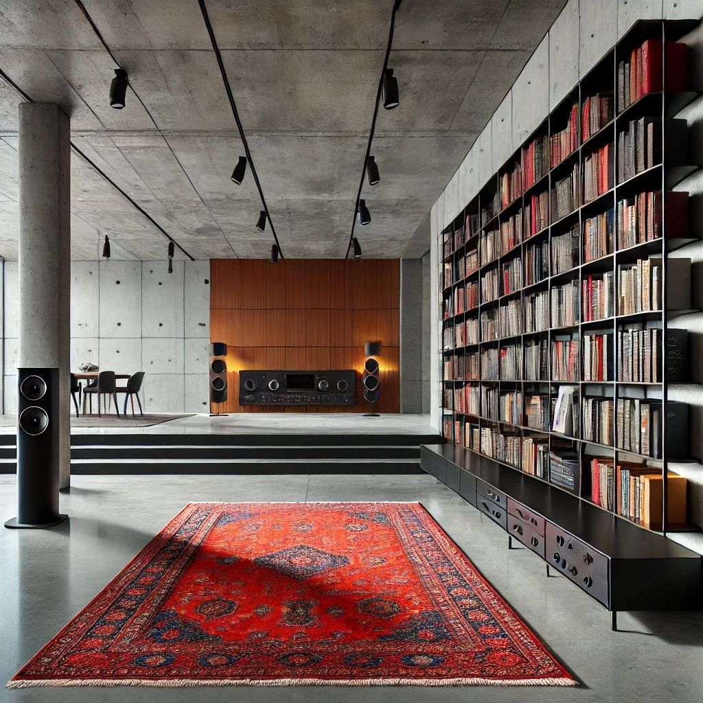Take this organic mid-century interior: low-slung wood ceilings and expansive glass walls create a strong horizontal sweep that connects interior to landscape. The design works with that flow rather than against it-sculptural, textured furniture (like the sheepskin-covered chair) sits low and soft, embracing the room’s natural width. Then a single dark-toned vertical element-the floor-to-ceiling bookcase-anchors the eye and creates necessary counterpoint without blocking sightlines or disrupting the connection to nature. The bold graphic rug and sculptural red coffee table add personality and warmth whilst respecting the architecture’s bones.